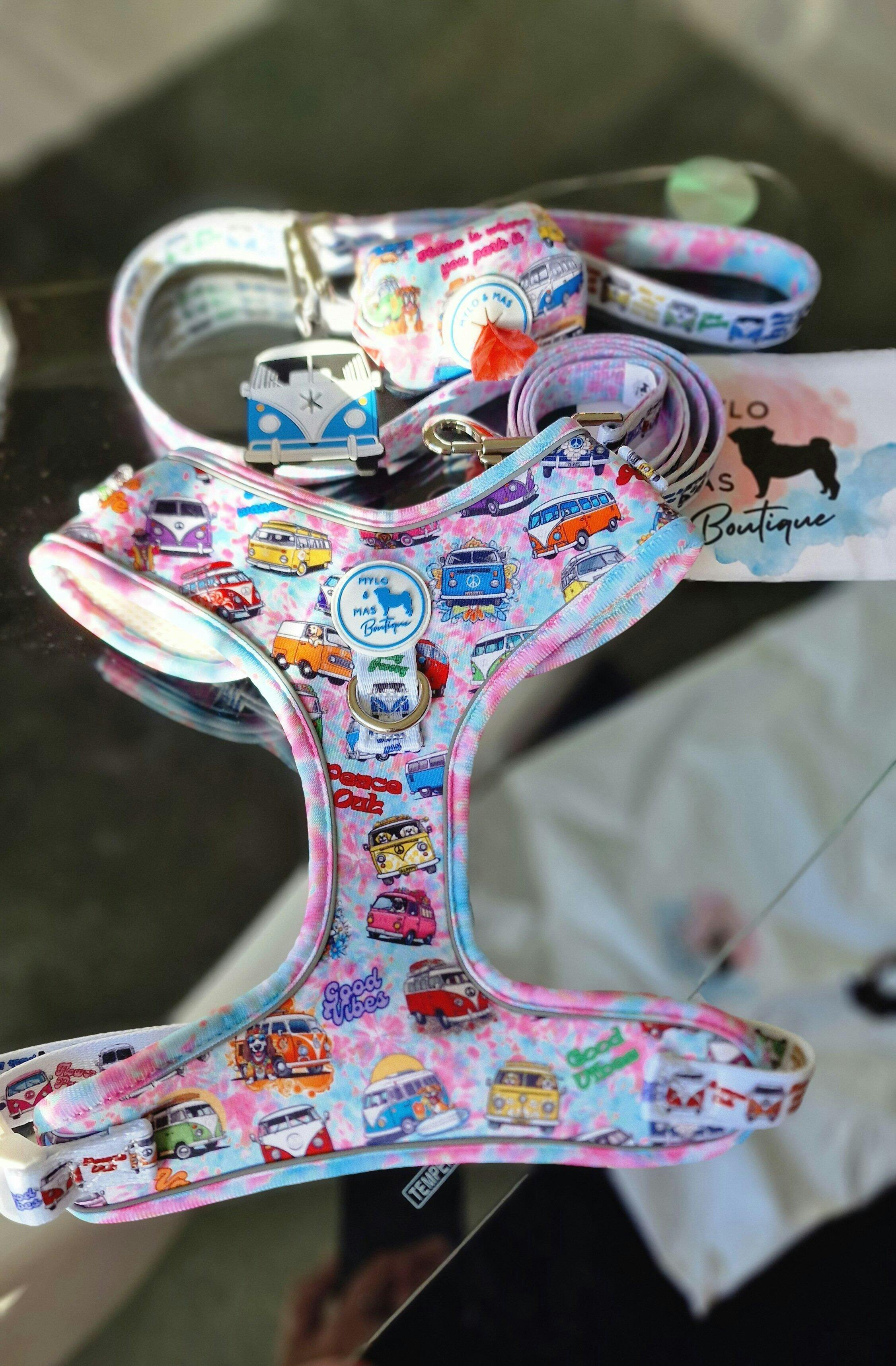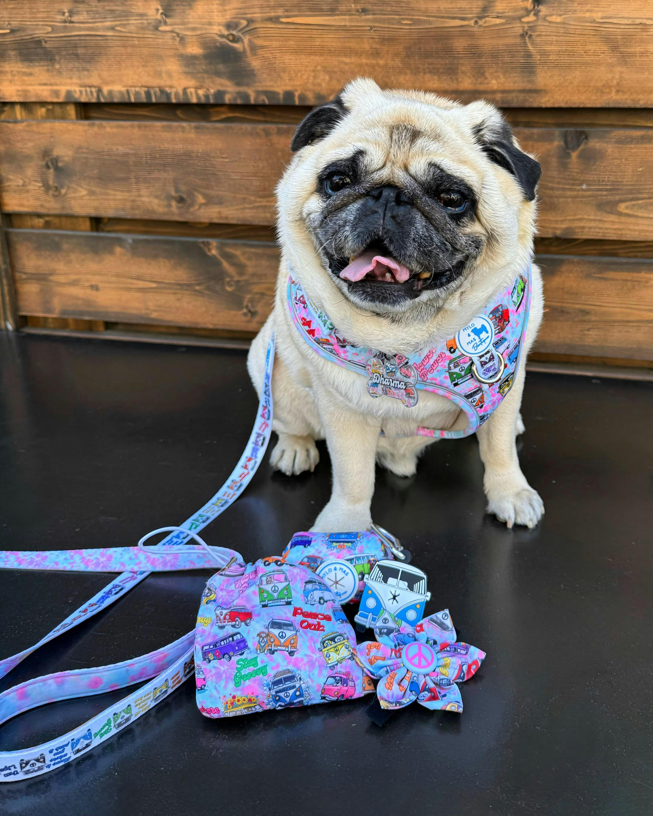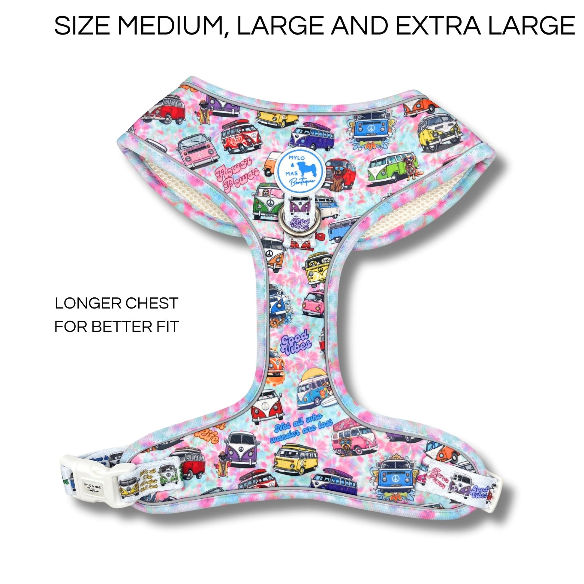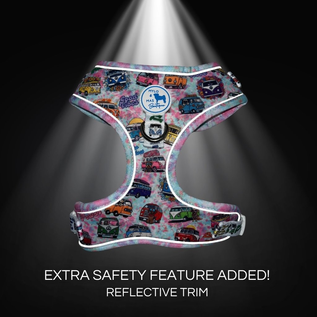 Hit the road in comfort and style with the Hippie Van Life Adjustable Harness! Featuring colourful hippie vans, playful quotes, set against a vibrant retro pink and blue tie-dye background, this harness is fully adjustable to fit pups of all shapes and sizes. Lightweight, comfy, and secure, it also has reflective trim for extra visibility at night. Perfect for strolling, road-tripping, or just enjoying carefree, flower-power adventures together.