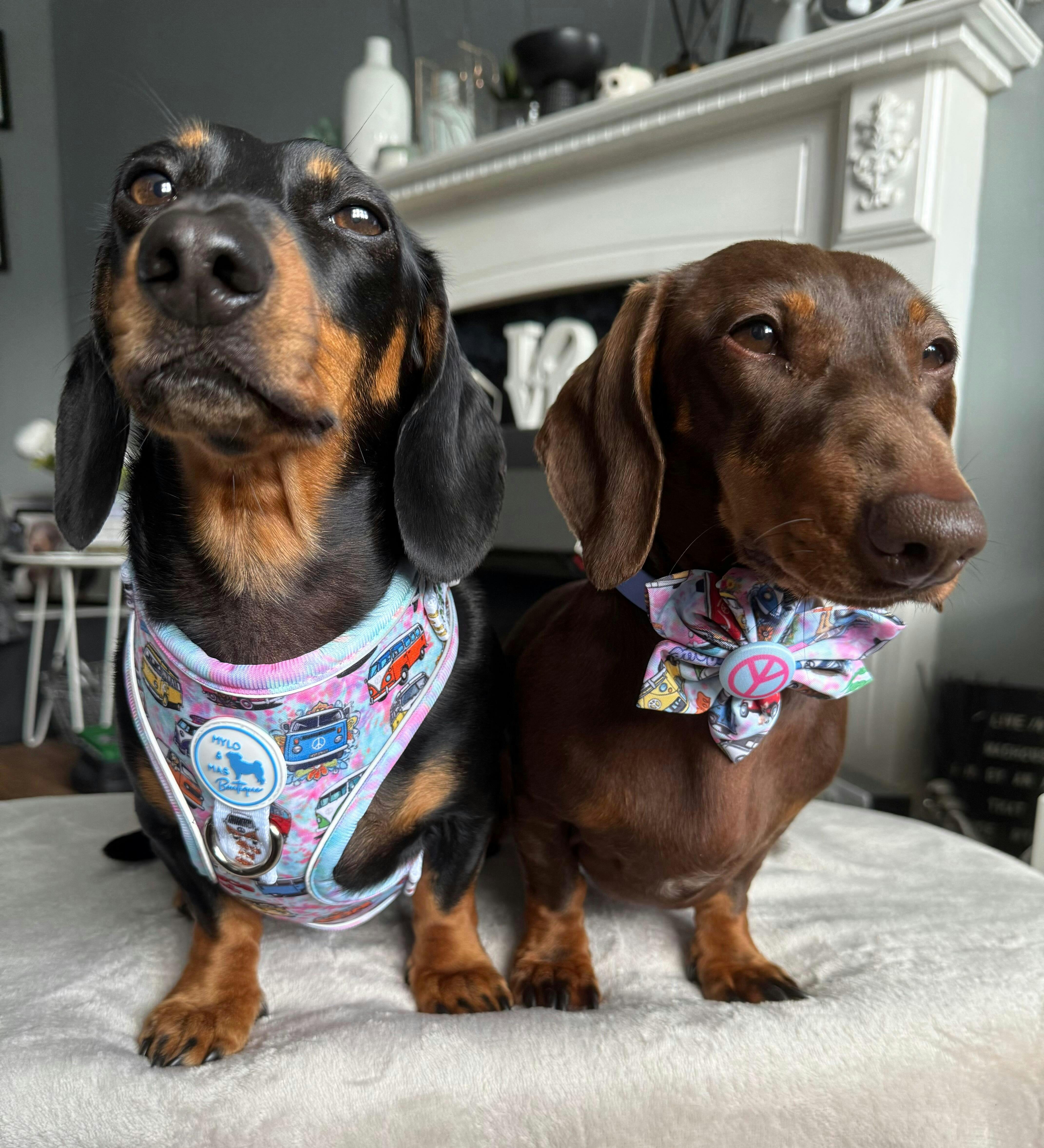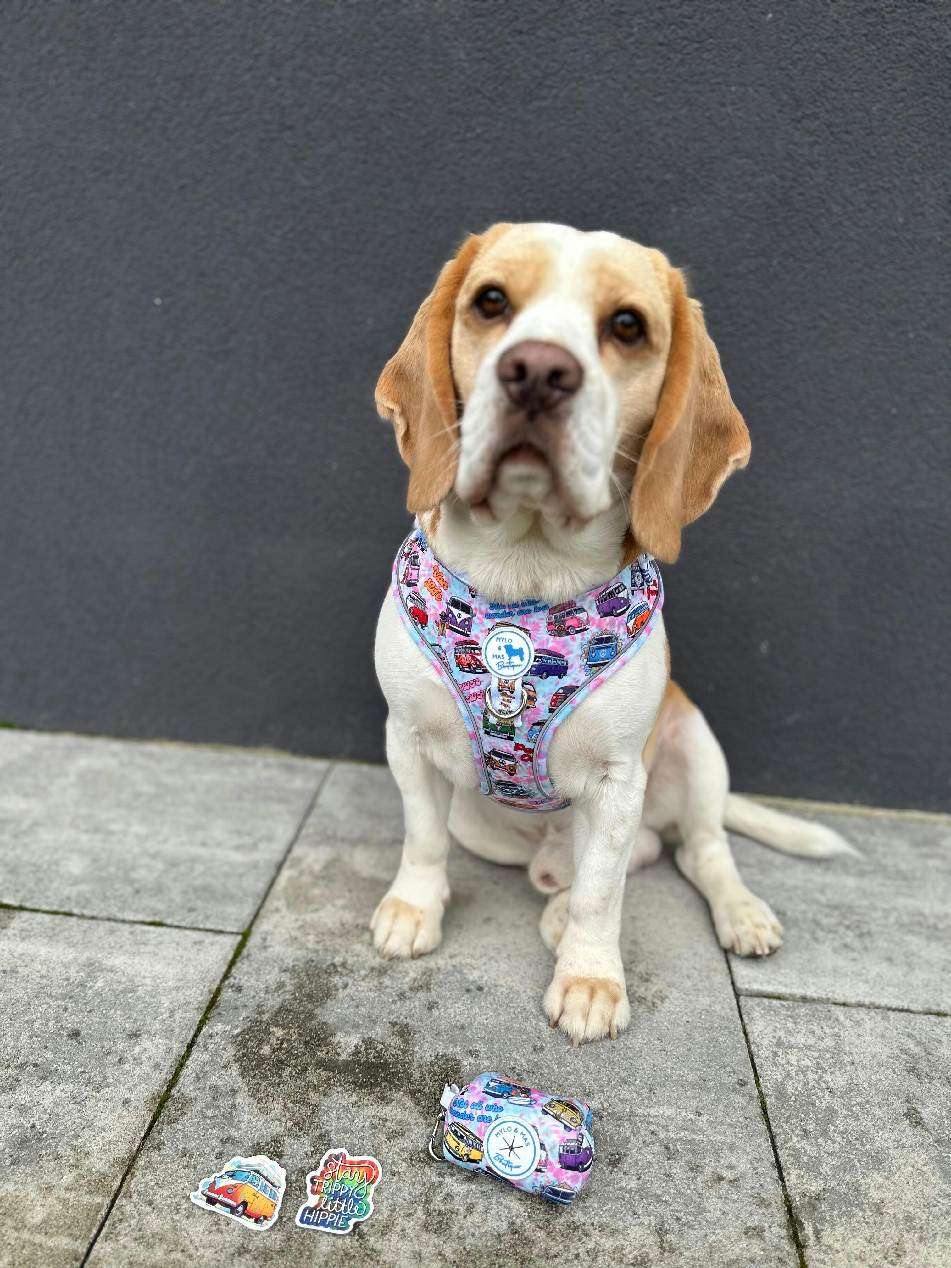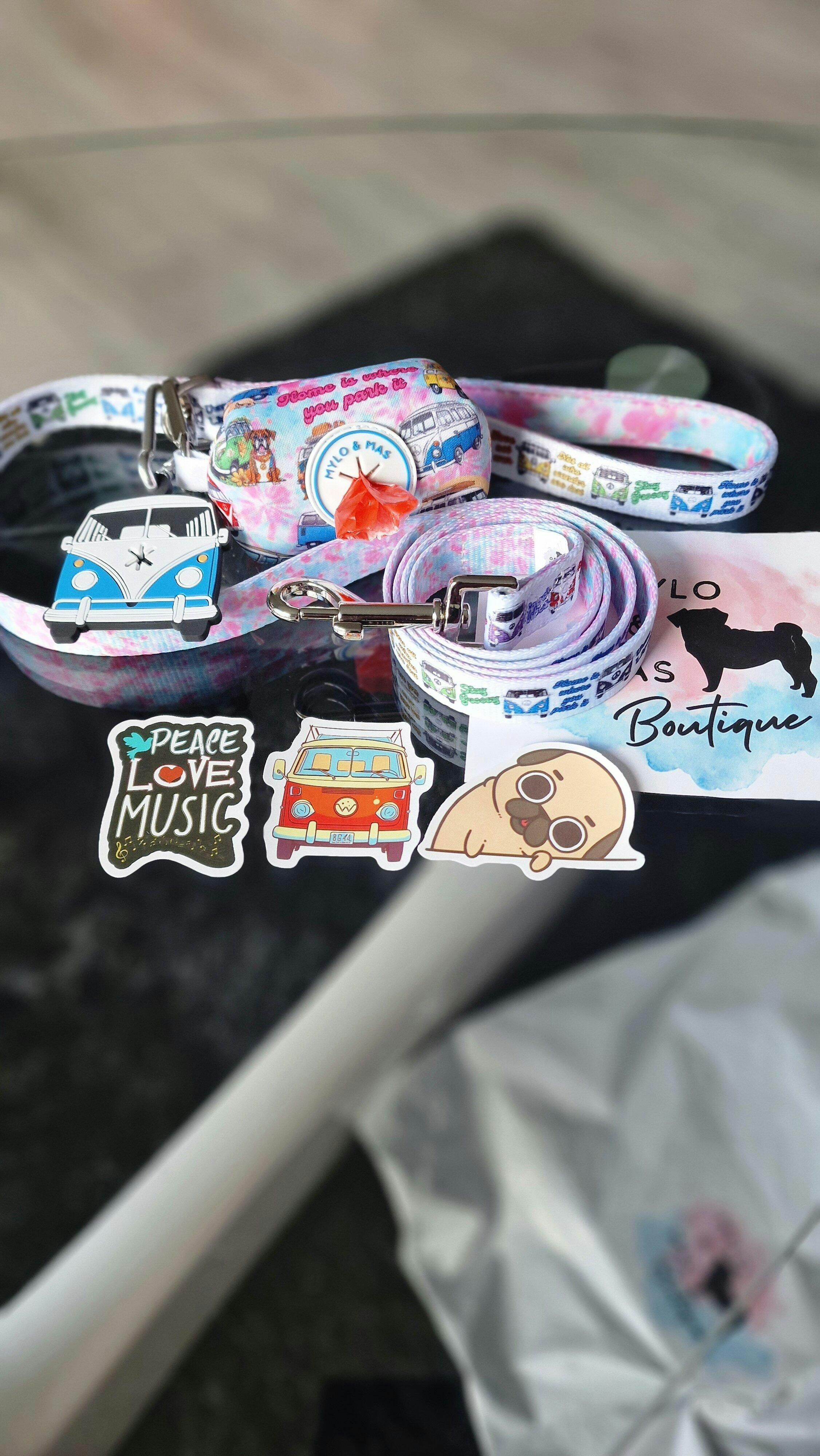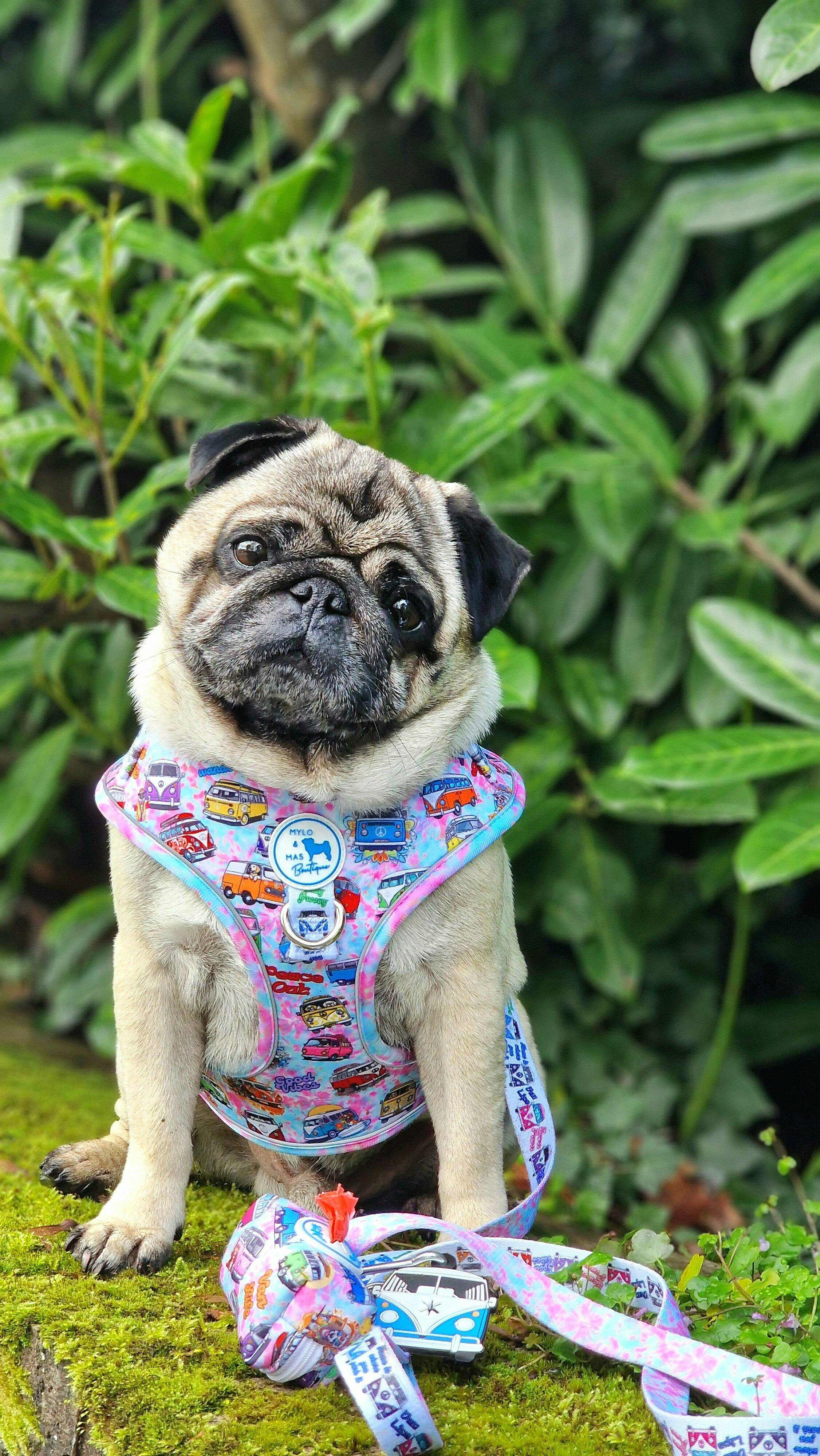 Hit the road in comfort and style with the Hippie Van Life Adjustable Harness! Featuring colourful hippie vans, playful quotes, set against a vibrant retro pink and blue tie-dye background, this harness is fully adjustable to fit pups of all shapes and sizes. Lightweight, comfy, and secure, it also has reflective trim for extra visibility at night. Perfect for strolling, road-tripping, or just enjoying carefree, flower-power adventures together.