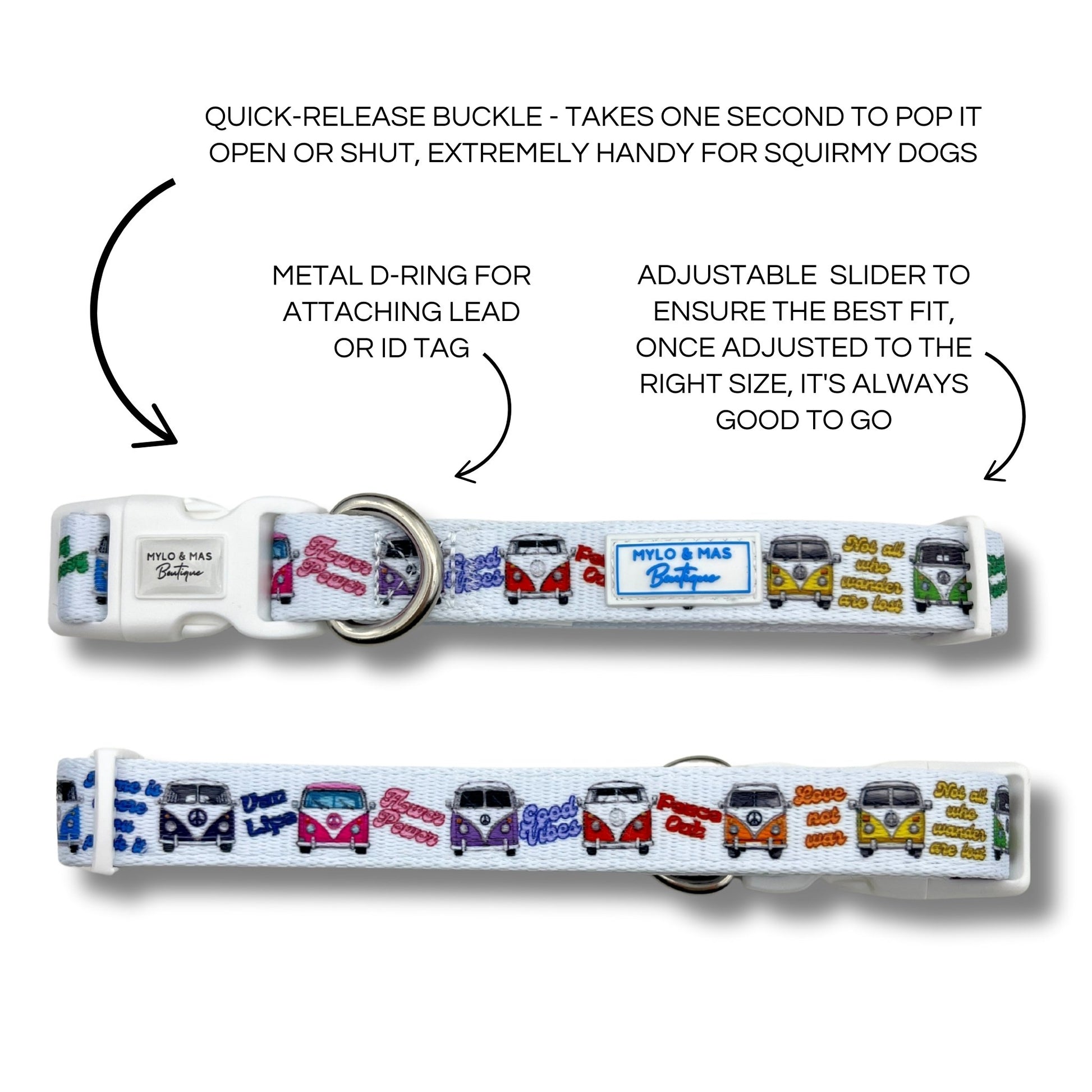 Add a splash of retro vibes to your pup’s everyday look with the Hippy Van Life Dog Collar! Featuring colourful hippy vans and groovy quotes, this comfy and durable collar is perfect for bringing joy, style, and flower-power fun wherever you go. Adjustable, secure, and totally groovy, it’s a must-have for every freewheelin’ pup.