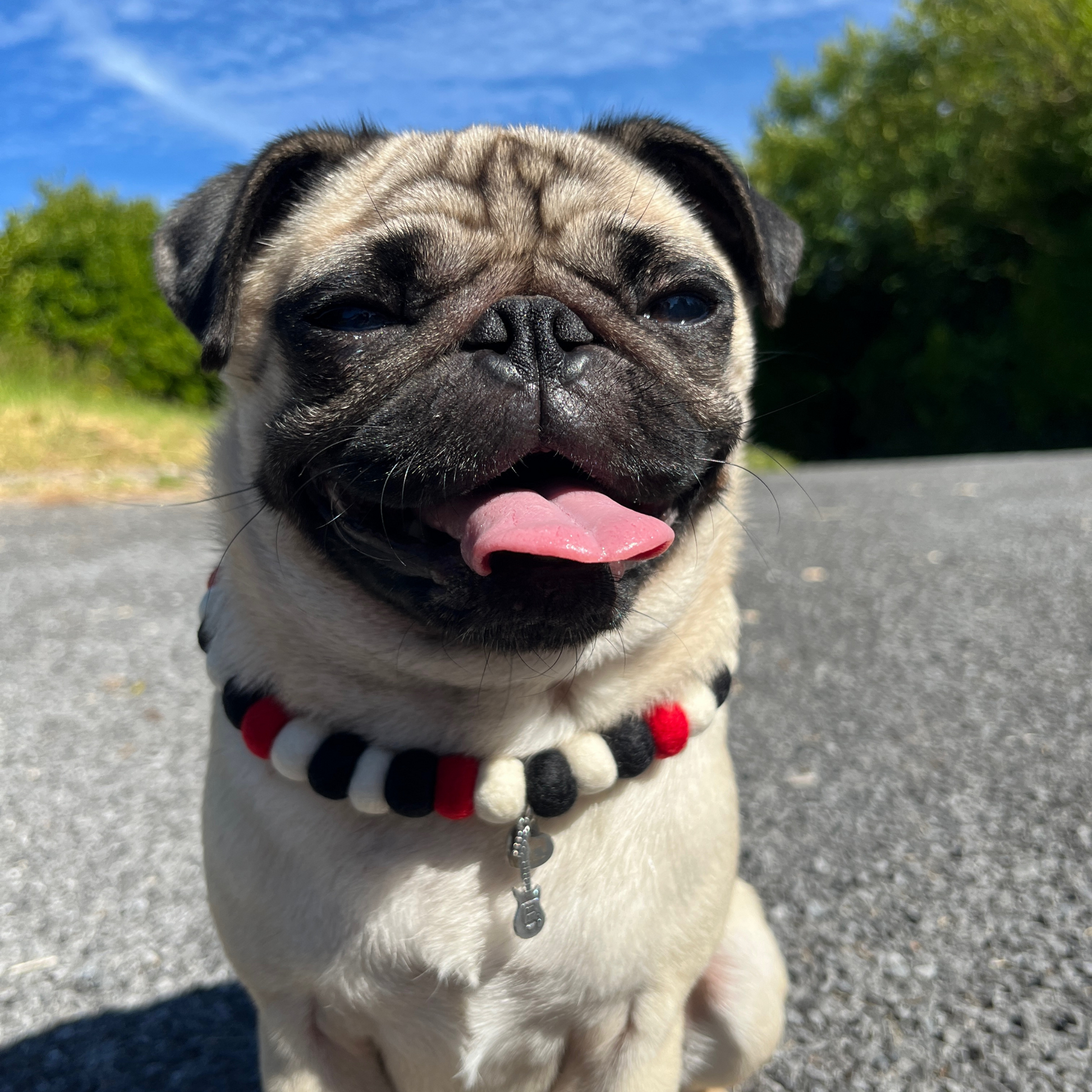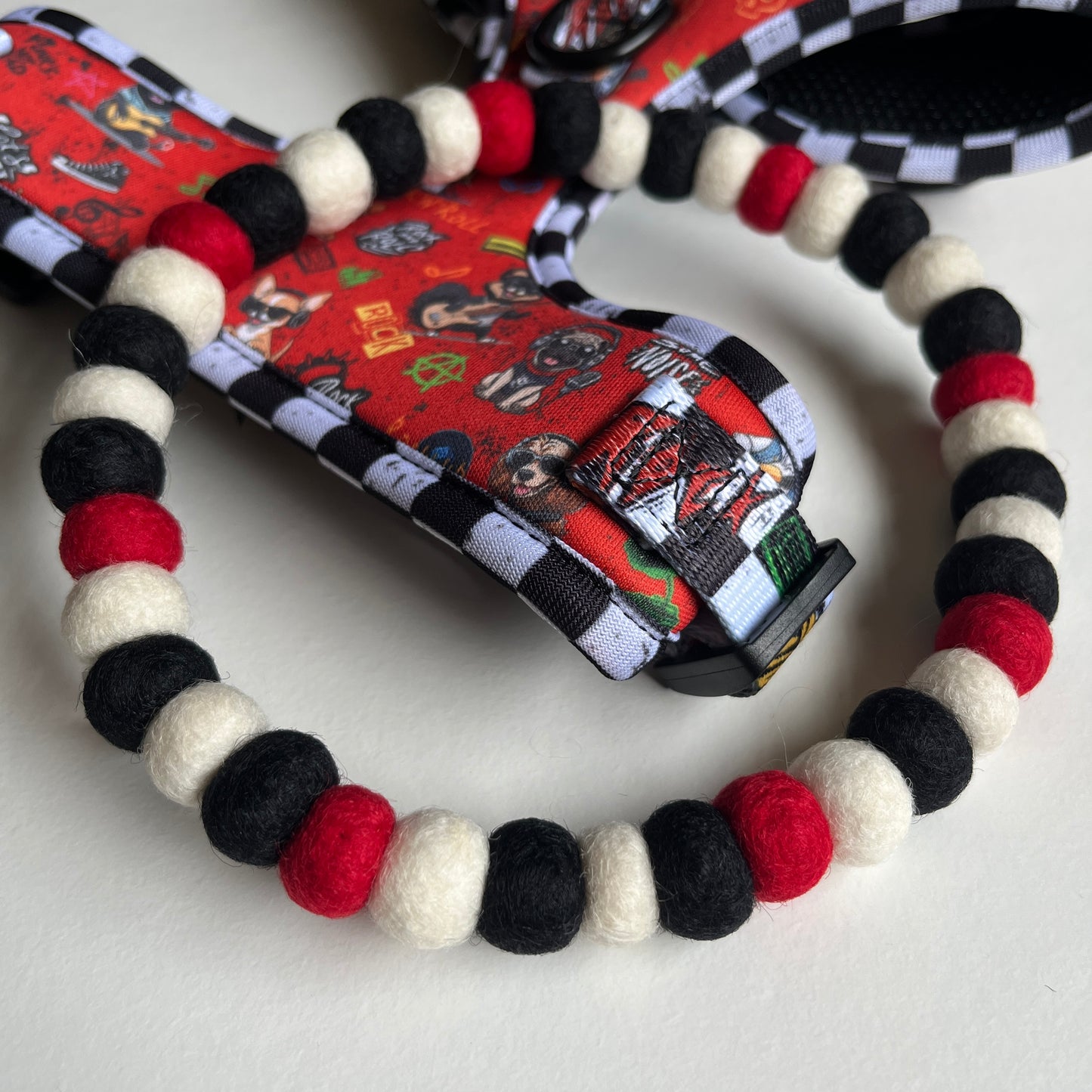 Rock out with your pup’s style! The Bone Jovie Dog Pom Pom Necklace features bold black, white, and red pom poms, creating a fun, rock-and-roll vibe that’s perfect for pups with a daring attitude.