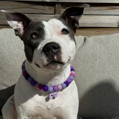 Each necklace is carefully handmade, ensuring a unique and high-quality finish. The felt balls are strung on a stretchy, durable string, making it easy to slip on and off without the hassle of clasps. Available in a variety of beautiful colour combinations, they make a standout accessory for any dog.