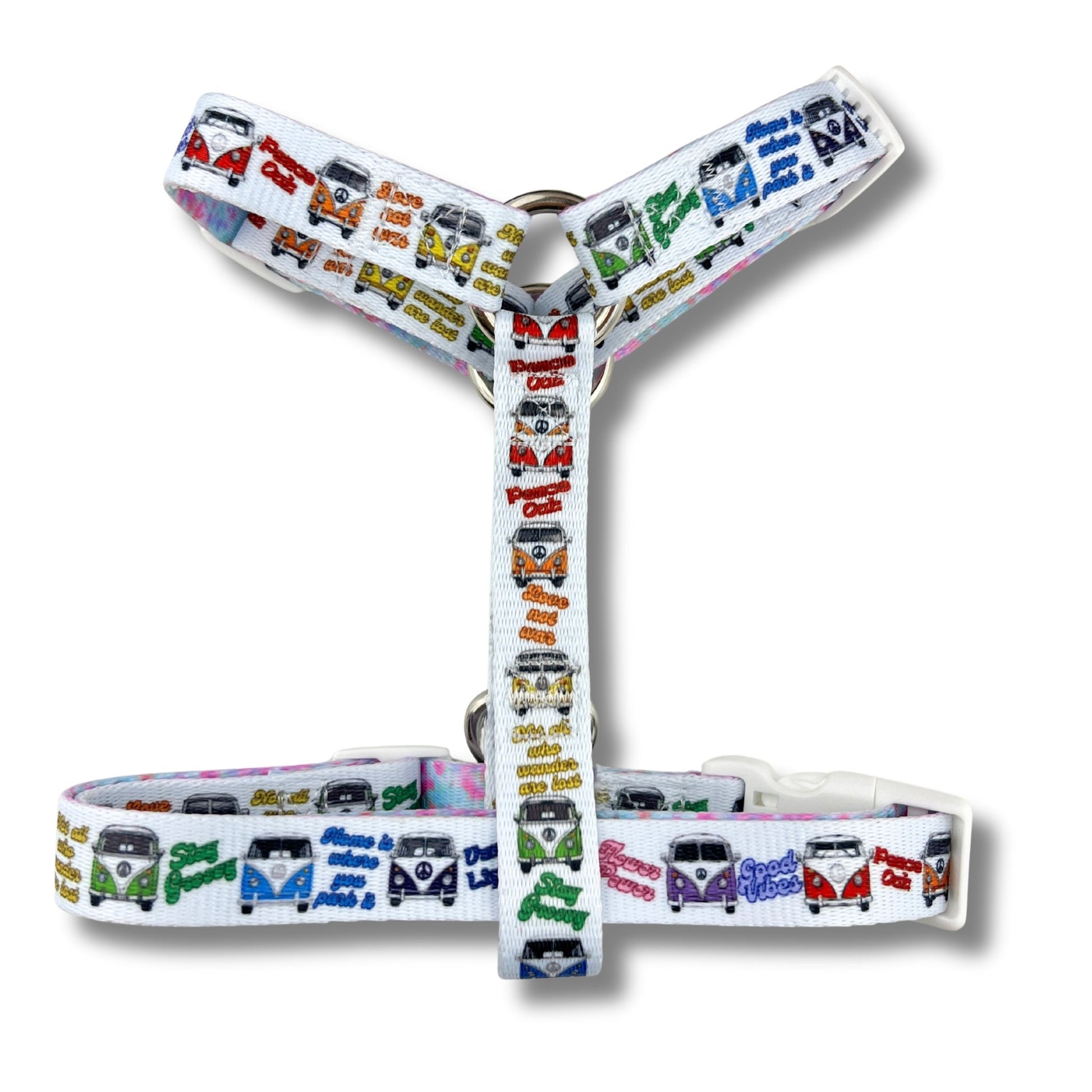Let your pup shine in style with the Hippy Van Life strap harness! Perfect for free spirits and flower power adventurers! Drenched in retro colours and good vibes, this lightweight harness keeps your furry friend comfy and secure, whether they’re cruising in the van, strolling through the park, or spreading peace and love wherever they go.